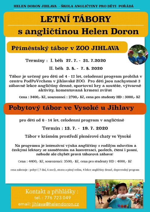 Pro letošní rok jsme přichystali 2 běhy příměstského tábora v jihlavské ZOO a dva letní kurzy angličtiny pro školáky. Pokud máte zájem o více informací, nebo byste se rádi přihlásili, ozvěte se nám na tel. 776 723 049.